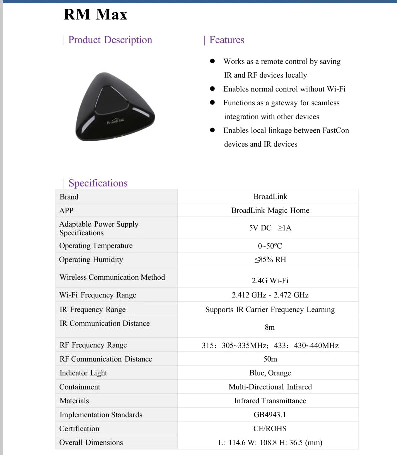 Broadlink MAX Smart Remote Hub, WiFi/BLE, IR/RF Control for TV & AC - RM MAX Add EU Plug